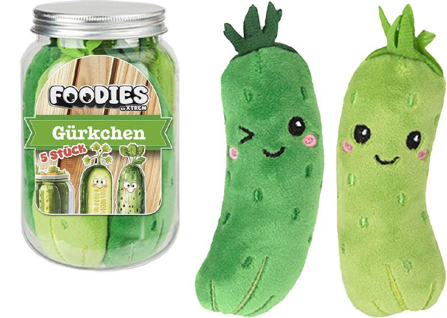 Essiggürkchen waren noch nie so niedlich! Hier kommen die super süßen Plüsch Essiggürkchen im Kunststoffglas von Foodies by XTREM. Jedes Glas enthält fünf Gürkchen, die einzeln entnehmbar sind! Größe ca. 13cm. Im Thekendisplay. Für Kinder ab 3 Jahren.