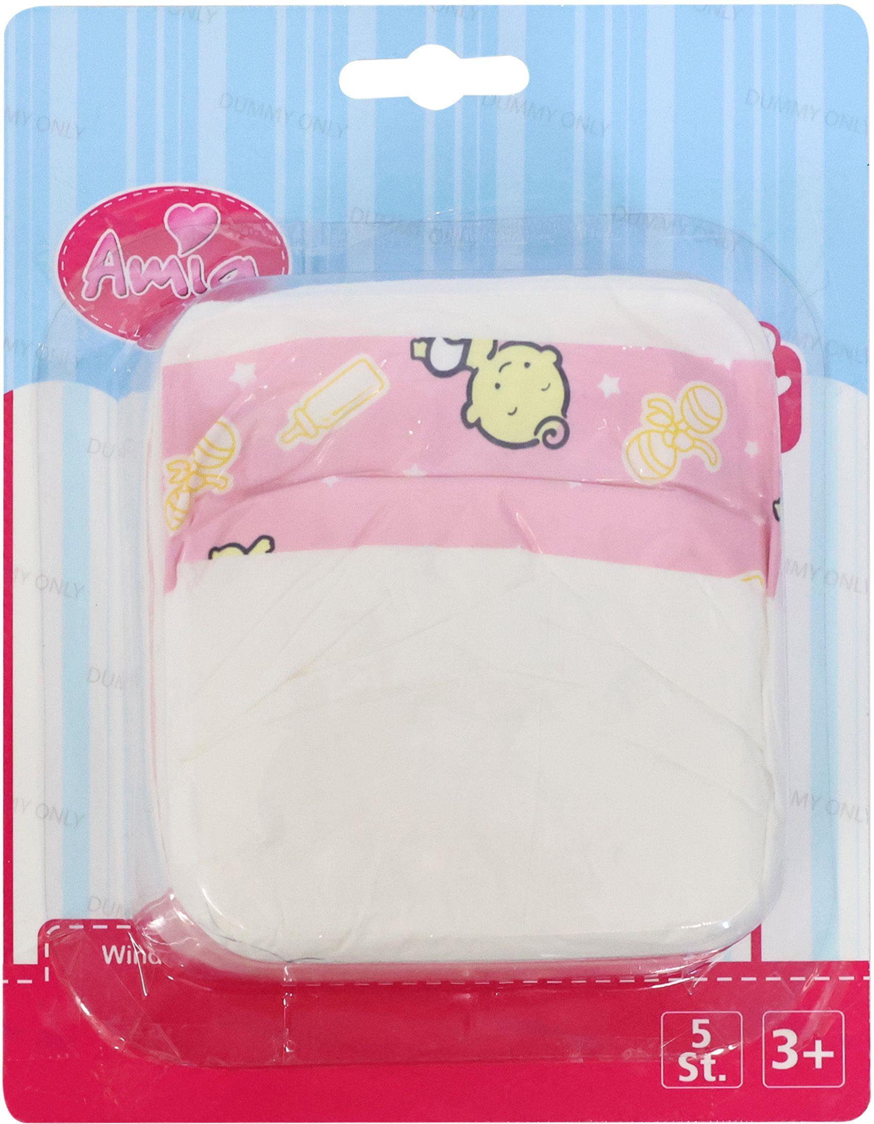 Die Amia Puppenwindeln sind für alle Puppen mit der Größe von ca. 30-42 cm geeignet. Aus Polyester. 5 Stück auf einer Blisterkarte. Maße ca. 18x6x23 cm. Für Kinder ab 3 Jahren.