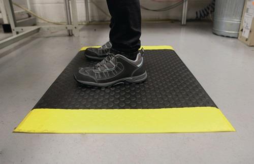 einlagige, ergonomische Arbeitsplatzmatte (aus Schaumstoff) mit griffiger Noppenoberfläche · ideal für Arbeitsplätze mit geringer bis mittlerer Belastung · geeignet für trockene Innenbereiche · wirkt kälteisolierend auf Betonböden · abgeschrägte Mattenränder reduzieren Stolpergefahren · mit gelben Kanten für bessere Sichtbarkeit · Brandschutz geprüft nach BS EN 13501-1 · Mattenstärke 9,5 mm