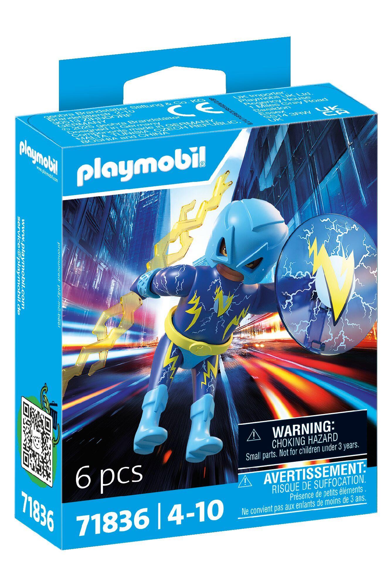 PLAYMOBIL Heroes: Blue Voltage – Der Blitz-Held Einer von vier Sammelhelden der PLAYMOBIL Heroes-Serie, mit denen du deine Helden- und Schurkenriege erweitern kannst! Der energiegeladene Blitz-Held Blue Voltage beeindruckt mit seinen blitzschnellen Reflexen und der Fähigkeit, Elektrizität zu erzeugen und daraus Schutzschilde zu formen. Mit seiner wechselbaren Maske kann er unerkannt bleiben, während er Gegner mit seinem Speer-Blitz präzise trifft.