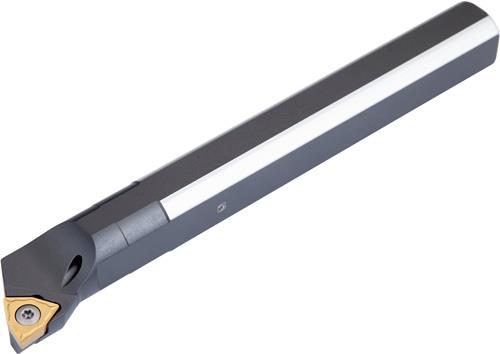 Dreh-Bohrstange mit Schraubklemmung zum spannen von 80° Trigonal positive Wendeschneidplatten mit einem Innenkreisdurchmesser von 9.525mm · 3.97mm Dick (ISO Bezeichnung WC.. 06T3.. ) · rechte Ausführung zum 95° Stirn-und Längsdrehen mit abgesetzem Schaft · Stahl mit Kühlkanalbohrung · 20mm Durchmesser x 180mm Länge für Innenkegeldrehen und Längsdrehen mit und ohne Schulter