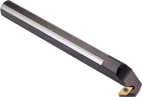 Dreh-Bohrstange mit Schraubklemmung zum spannen von 55° Rhombus positive Wendeschneidplatten mit einem Innenkreisdurchmesser von 9.525mm · 3.97mm Dick (ISO Bezeichnung DC.. 11T3.. ) · linke Ausführung zum Rückwärtsdrehen mit abgesetzem Schaft · Stahl ohne Kühlkanalbohrung · 40mm Durchmesser x 300mm Länge für Rückwärtsentgraten