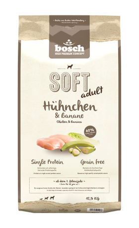 bosch Soft Hühnchen + Banane ist ein single Rohprotein - Produkt für die ausgewogene Ernährung ausgewachsener Hunde aller Rassen. Der hohe Anteil an frischem Hühnchen (min. 60 %) als alleinige , tierische Rohproteinquelle verleiht dem Produkt eine außergewö-hnliche Eiweißqualität. Durch die Verwendung stärkehaltiger Banane (min 8 %) als wichtigen Kohlenhydratträger sowie hochverdauliche Kartoffel ist Soft Hühnchen + Banane komplett getreidefrei . Der hö-here Feuchtigkeitgehalt (18 %) verleiht der Krokette eine weiche Konsistenz .