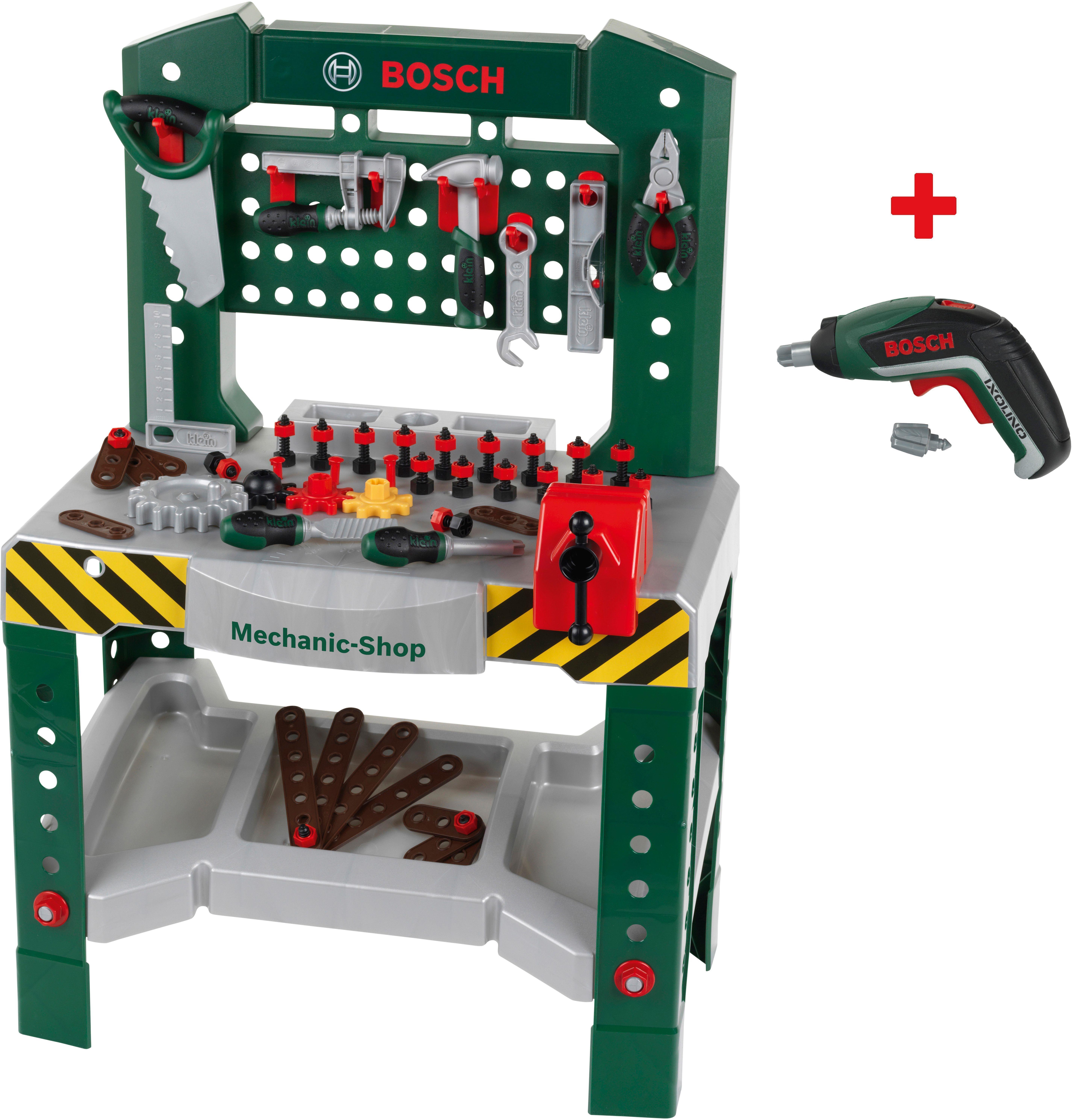Bosch Werkbank 77tlg + Ixolino II. Mit zahlreichem Zubehör. Maße der Werkbank (L x B X H): 57 x 35 x 86cm. Ab 3 Jahren