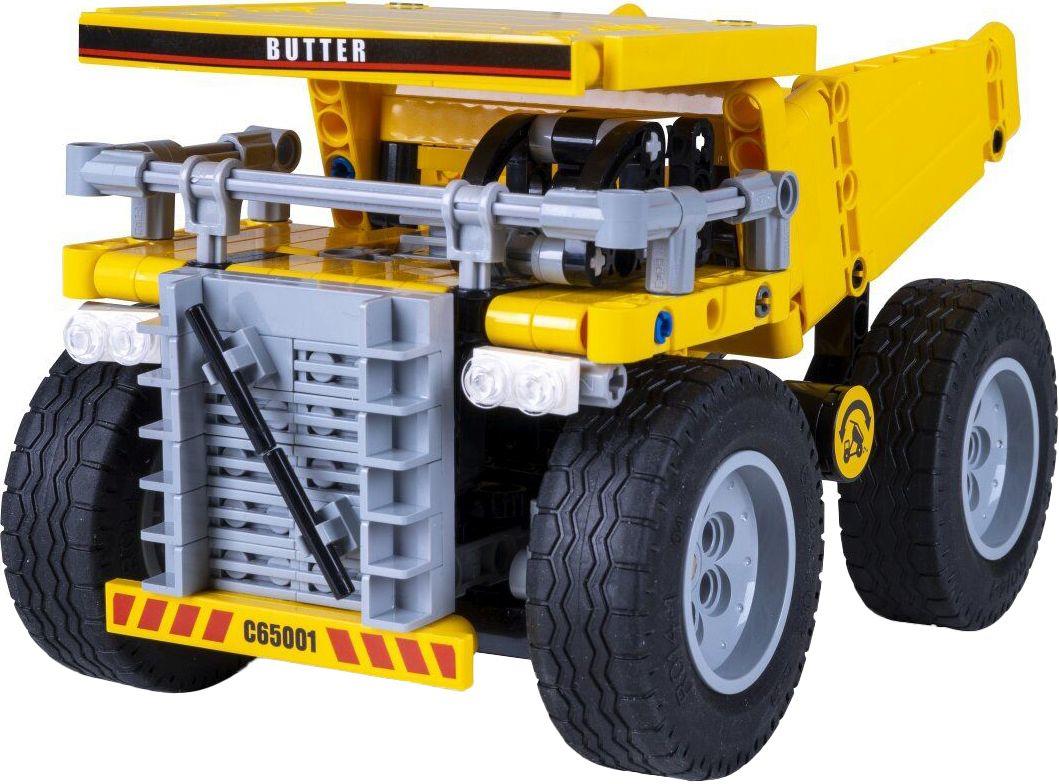 · Bauteile werden durch einfaches Zusammenstecken miteinander verbunden · Profilierte Gummireifen · Bedienknopf für Kippmulde · Bedienknopf für Lenkung · Schüttgut für Ladefläche · Fördert die Feinmotorik und technisches Verständnis