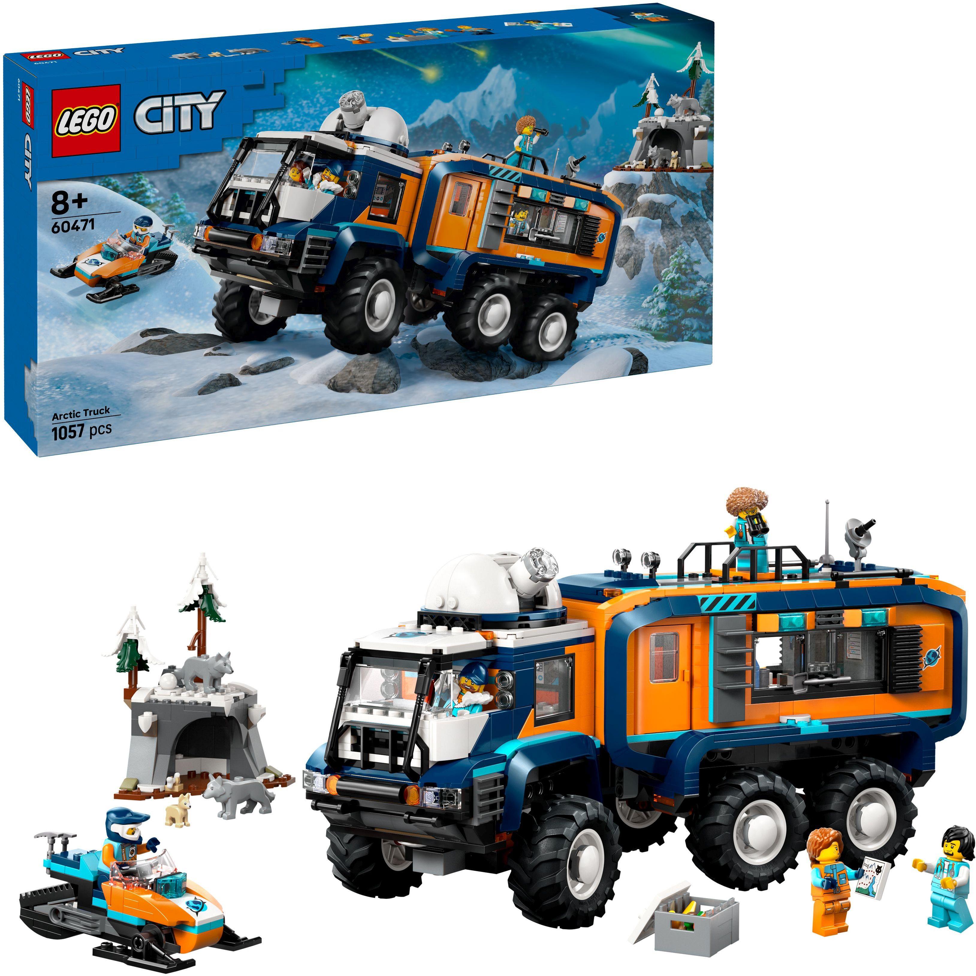Überrasche einen jungen Abenteurer mit dem LEGO City Arktis-Truck mit Labor (60471) für Fans von MINT-Spielzeug ab 8 Jahren. Dieses Spielset beinhaltet einen 6-rädrigen Spielzeug-Truck mit Knicklenkung, grobstolligen Reifen und drehbarer Sternwarte auf dem Dach. Zu den coolen Details im Inneren zählen die Fahrerkabine, das Labor und der gemütliche Wohnbereich mit Bad, Küche und Schlafzimmer. Auch ein Schneemobil, das Modell einer Höhle in der Arktis, 5 Polarforscher-Mini-Figuren, 2 Polarwölfe und 1 Polarwolfwelpe lassen Kinder fantasievoll spielen. Zu dem Truck aus diesem LEGO City Set mit Polarwölfen ist neben der beiliegenden gedruckten Bauanleitung auch eine digitale Anleitung in der LEGO Builder App verfügbar. In der App können Kinder 3D-Ansichten der Modelle vergrößern und drehen, beim Bauen ihren Baufortschritt verfolgen und Sets speichern. LEGO City Sets beinhalten Fahrzeuge, Bauwerke und Figuren für ein fantasievolles Spielerlebnis. Für noch größere Abenteuer können Kinder dieses Modell auch mit anderen separat erhältlichen kreativen LEGO City Sets kombinieren. Das Set besteht aus 1.064 Teilen. Der LKW in diesem Set ist über 17 cm hoch, 38 cm lang und 12 cm breit. Enthält 1064 Teile.