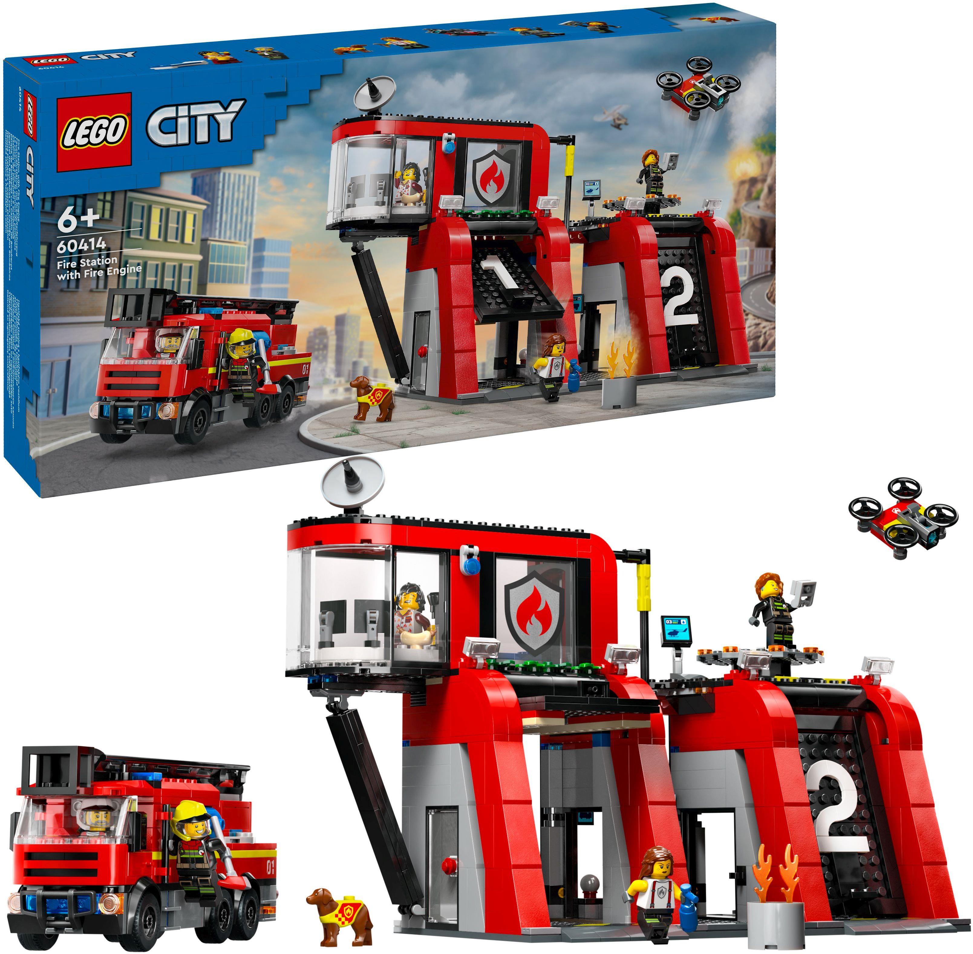 Die LEGO City Feuerwehrstation mit Drehleiterfahrzeug (60414) ist ein Feuerwehr-Spielzeug, das Kinder ab 6 Jahren besonders fantasievoll spielen lässt. Schick die 5 LEGO Feuerwehrmann-Minifiguren und den Feuerwehrhund in viele spannende Löscheinsätze. In der LEGO Feuerwache sind eine moderne Leitstelle, eine kleine Küche, ein Schlafraum über dem Geräteraum sowie 2 Fahrzeughallen mit hohen Schwingtoren untergebracht. Darüber hinaus beinhaltet das die Spielzeug-Feuerwehrstation eine Drohne und ein cooles Spielzeug-Feuerwehrauto mit 2 Anbaumodulen – einer Drehleiter und einer Löschkanone. Neben einer verständlichen gedruckten Anleitung ist für dieses LEGO City Feuerwache Set auch eine Schritt-für-Schritt-Anleitung in der LEGO Builder App verfügbar. Digitale Funktionen lassen dein Kind beim Bauen 3D-Modellansichten vergrößern, drehen und aus jedem Winkel betrachten. Für noch größere Abenteuer kann dein Kind dieses Set mit anderen separat erhältlichen LEGO City Sets kombinieren. LEGO City Feuerwehr-Spielzeuge beinhaltet detailreiche Land-, Luft- und Wasserfahrzeuge, damit Kinder fantasievoll und ohne Limits spielen können. Dieses LEGO City Feuerwache-Spielzeug mit Auto ist ein tolles Weihnachts-, Oster- oder Geburtstagsgeschenk für junge Brandmeister. Die Feuerwehrstation ist 22 cm hoch, 32 cm breit und 14 cm tief. Enthält 843 Teile.