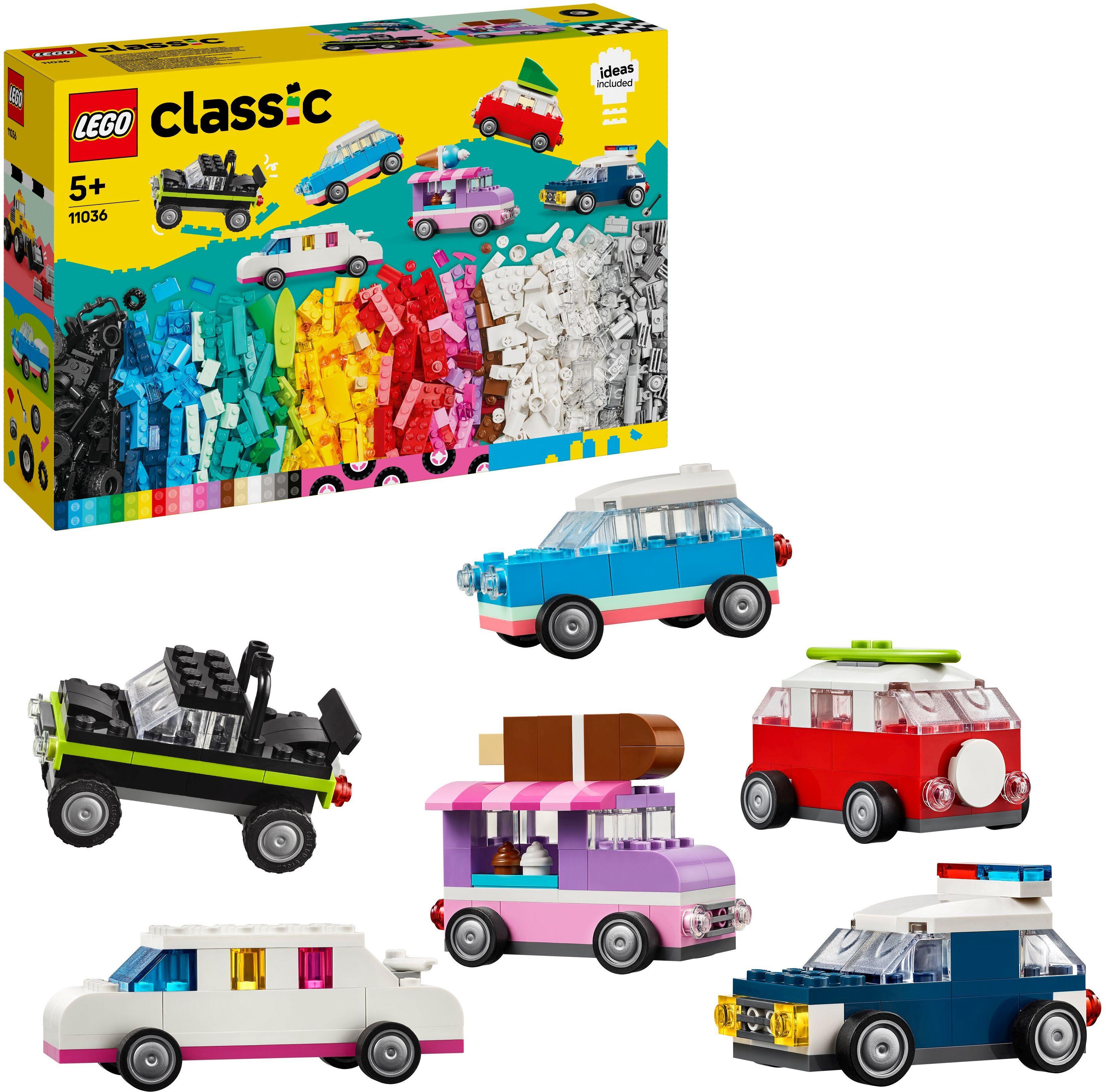 LEGO Classic Kreative Fahrzeuge (11036) ist ein Auto-Baukasten, der einen Mix aus Bausteinen, Teilen und einfachen Bauanleitungen enthält, um immer wieder neue LEGO Fahrzeuge erschaffen zu können. Aus 900 Bausteinen und speziellen Teilen wie den 52 Rädern kann dein Kind mithilfe der einfachen Anleitungen ein LEGO Polizeiauto-Spielzeug, einen Eiswagen, ein Quad, einen Schaufellader, ein LKW-Spielzeug, einen Kombi, einen Geländewagen und eine Stretchlimousine bauen. Verschiedene Designideen, coole Details und bunte Verzierungen laden dann dazu ein, die Spielzeugautos vielseitig umzugestalten. 10 fantasievolle Ideen in der Bauanleitung dieses LEGO Auto Sets inspirieren zum Bau eigener Modelle. Die Bauanleitungen sind auch in der LEGO Builder App verfügbar, die Kinder digitale Modellansichten vergrößern und drehen sowie ihren Baufortschritt verfolgen lässt. LEGO Classic Konstruktionsspielzeuge liefern jede Menge Spielideen und Tipps und lassen Eltern wichtige Entwicklungsschritte ihrer Kinder miterleben. Dieser LEGO Classic Fahrzeug Bausatz ist ein tolles Geschenk für Jungs, Mädchen und alle kleinen Auto-Fans ab 5 Jahren. Die Stretchlimousine ist 9 cm lang. Enthält 900 Teile.