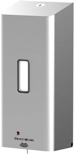 Stück ObjectLine Seifenspender Non·Touch Format (HxBxT): 275x111x101 mm für 800·ml·Seife. Gehäuse aus Edelstahl gebürstet · Werkstoff 1.4301 · mit frontseitiger Füllstandsanzeige · verchromtes · versenktes Zylinderschloss Deckeloberseite. Sensorgesteuerte voreingestellte Seifenausgabe durch Infrarot· Annäherungselektronik. Tropffrei durch Rücksaugpumpe. Freie Befüllung des Leerbehälters mit Flüssigseife und Waschlotionen. Komplett einschließlich Erstfüllung und Befestigungsmaterial · Lieferung und Montage (incl. Batterien).