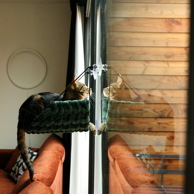 D&D Home Sofia ist ein modernes und stilvolles Katzenbett, das am Fenster befestigt werden kann, ein erhöhter Ruheplatz für deine Katze. Ideal für Katzen, die gerne alles im Haus und um das Haus herum im Auge behalten möchten. Das Bett besteht aus einem stabilen Metallrahmen mit 3 starken Saugnäpfen (Max. Belastbarkeit 10kg). Die Liegefläche wird durch ein geflochtenes Polyfiber-Velvetseil um den Rahmen gebildet. Dieses Bett wirst du nicht schnell an anderer Stelle finden und ist ein echtes "Dutch Design"-Produkt.