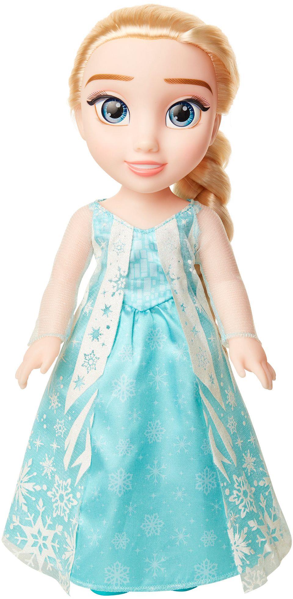 Aufregende Abenteuer mit Anna und Elsa! Die hübschen Prinzessinnen sind abenteuerlustig und begeben sich mit ihren Freunden immer wieder auf spannende Ausflüge. Mit dieser wunderschönen Spielpuppe im Elsa Look können die Lieblingsszenen aus dem Film ganz einfach nachgespielt oder eigene Geschichten erfunden werden. Die Puppe ist ca. 35 cm groß und verzaubert mit ihrem originalgetreuen Outfit – genau wie im Film. Das einzigartige Cape und ihre wunderschönen, blonden Haare garantieren ein unvergleichliches PrinzessinnenErlebnis. Dabei erstrahlen ihre filigran gearbeiteten RoyalReflection™ Augen wie magisch. Auf ins Abenteuer mit Anna! Das Set enthält 1 Elsa Puppe mit Kleid, Umhang und Schuhe. Geeignet ab 3 Jahren.