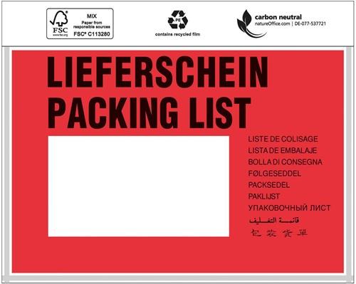 Standardqualität für den optimalen Versand von Begleitpapieren. Schutz vor Schmutz · Nässe und Beschädigung. Leichte Anbringung: Versandpapiere einlegen · aufkleben fertig. Material: LDPE-Folie 60 µ (Oberfolie 40 µ · Unterfolie 20 µ) · transparent. Silikonpapier 46 g/m² Aus Recyclingfolie mit 50 % PCR-Anteil und Papier Klimaneutral