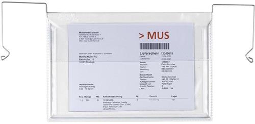 Zur Befestigung von Begleitpapieren und Dokumenten an Gitterboxen und Transportkisten Stabile · transparente Folientaschen aus 180 µ starker PVC-Folie Mit eingeschweisstem · umlaufendem Federstahlbügel Schnell und einfach ohne Hilfsmittel zu befestigen Verschlussklappe bietet Schutz vor Schmutz · Regen etc.