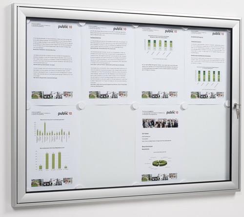 Schaukästen für den Innen- und Außenbereich · Aluminiumkonstruktion, silberfarbig eloxiert · mit abgerundetem Profil · zur Wandmontage · Magnethaftende, weiße Rückwand (inkl. 4 Magneten) · Bautiefe 30 mm · um 90° Grad drehbare Tür aus geschliffenem ESG-Sicherheitsglas (Ausführung für 16 Blätter Acrylglas) · Sicherheitsschloss mit 2 Schlüsseln