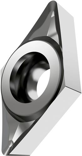 Einseitige positive Drehwendeschneidplatte · 55° Rhombisch mit 7° Freiwinkel · Innenkreisdurchmesser von 6.35mm · 2.38mm Dick · 0.4mm Radius · Indexgenauigkeit nach ISO-Toleranzklasse-G · Spanbrecher AL mit scharfer Schneidkante · im Substrat T0315 · PVD beschichtet WC-Co Feinkornsubstrat im ISO-Bereich N05 -N20 · zum schlichten bis schruppen bearbeiten von Nichteisenmetallen