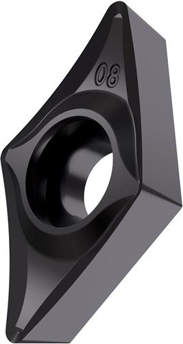 Einseitige positive Drehwendeschneidplatte · 55° Rhombisch mit 7° Freiwinkel · Innenkreisdurchmesser von 9.525mm · 3.97mm Dick · 0.2mm Radius · Indexgenauigkeit nach ISO-Toleranzklasse-G · Spanbrecher SF3 mit verrundeter Schneidkante · im Substrat T6310 · PVD beschichtet WC-Co Feinstkornsubstrat in den ISO-Bereichen M01 -M15/N05 -N20 und S01 -S15 · zum schlichten bis medium bearbeiten von nichtrostenden Stählen · Nichteisenmetallen und Superlegierungen