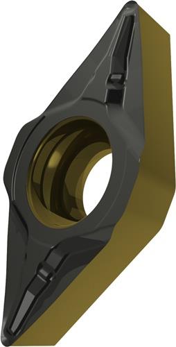 Einseitige positive Drehwendeschneidplatte · 55° Rhombisch mit 7° Freiwinkel · Innenkreisdurchmesser von 6.35mm · 2.38mm Dick · 0.4mm Radius · Indexgenauigkeit nach ISO-Toleranzklasse-M · Spanbrecher UR mit verrundeter Schneidkante · im Substrat T9415 · MT-CVD beschichtet WC-Co Substrat im ISO-Bereich P05 -P30 · zum schlichten bis schruppen bearbeiten von Stählen