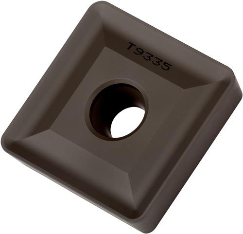 Einseitige positive Drehwendeschneidplatte · Viereckig mit 7° Freiwinkel · Innenkreisdurchmesser von 38.1mm · 9.52mm Dick · 3.2mm Radius · Indexgenauigkeit nach ISO-Toleranzklasse-M · Spanbrecher DR4 mit verrundeter Schneidkante · im Substrat T9335 · MT-CVD beschichtet functionally graded WC-Co carbide im ISO-Bereich P20 -P45 · zum schruppen bis schweres schruppen bearbeiten von Stählen