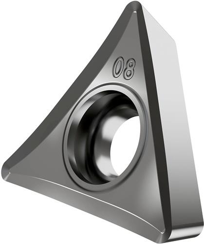 Einseitige positive Drehwendeschneidplatte · Triangular mit 7° Freiwinkel · Innenkreisdurchmesser von 9.525mm · 3.97mm Dick · 0.4mm Radius · Indexgenauigkeit nach ISO-Toleranzklasse-G · Spanbrecher SF3 mit verrundeter Schneidkante · im Substrat H07 · unbeschichtet WC-Co Substrat in den ISO-Bereichen N10 -N30 und S01 -S20 · zum schlichten bis medium bearbeiten von Nichteisenmetallen und Superlegierungen