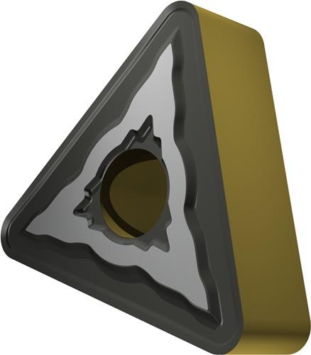 Doppelseitige negative Drehwendeschneidplatte · Triangular mit Innenkreisdurchmesser von 9.525mm · 4.76mm Dick · 1.2mm Radius · Indexgenauigkeit nach ISO-Toleranzklasse-M · Spanbrecher NMR mit verrundeter Schneidkante · im Substrat T9415 · MT-CVD beschichtet WC-Co Substrat im ISO-Bereich P05 -P30 · zum schlichten bis schruppen bearbeiten von Stählen