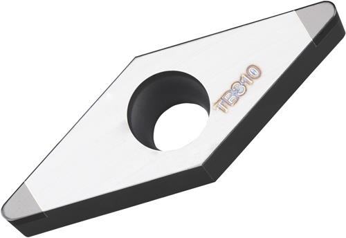 Wendeschneidplatte zum Hartdrehen mit 2 einseitig gekippten CBN-Ecken · 35° Rhomboid mit 5° Freiwinkel · Innenkreisdurchmesser 9.525mm · 4.76mm Dick · 0.8mm Schneidenradius · Wiederholgenauigkeit nach ISO-Toleranzklasse G · verrundeter und facettierter Schneidkante T-land -20°/0.1mm · im Substrat TB310 · unbeschichtetes CBN im ISO-Bereich H01-H10 · zur Hochvorschub Bearbeitung von gehärtetem Stahl