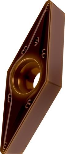 Einseitige positive Drehwendeschneidplatte · 35° Rhombisch mit 5° Freiwinkel · Innenkreisdurchmesser von 9.525mm · 4.76mm Dick · 1.2mm Radius · Indexgenauigkeit nach ISO-Toleranzklasse-M · Spanbrecher RM mit verrundeter Schneidkante · im Substrat T8430 · PVD beschichtet WC-Co Feinkornsubstrat in den ISO-Bereichen P20 -P40 und M20 -M35 · zum schlichten bis schruppen bearbeiten von Stählen und nichtrostenden Stählen