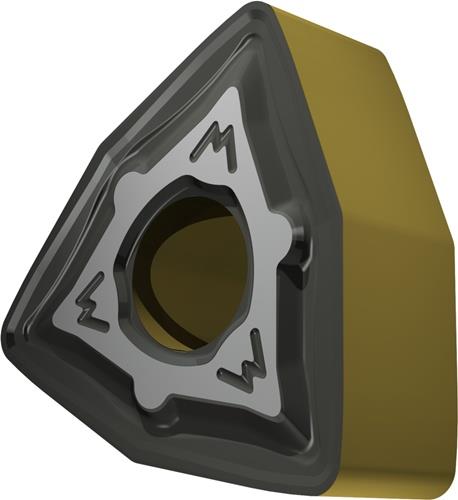 Doppelseitige negative Drehwendeschneidplatte · 80° Trigon mit Innenkreisdurchmesser von 9.525mm · 4.76mm Dick · 0.8mm Radius · Indexgenauigkeit nach ISO-Toleranzklasse-M · Spanbrecher M mit Wiper-Geometrie · im Substrat T9415 · MT-CVD beschichtet WC-Co Substrat im ISO-Bereich P05 -P30 · zum schlichten bis schruppen bearbeiten von Stählen