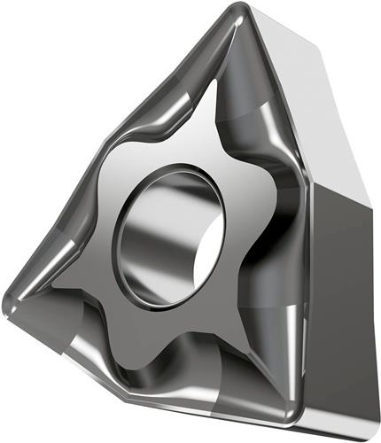 Doppelseitige negative Drehwendeschneidplatte · 80° Trigon mit Innenkreisdurchmesser von 12.7mm · 4.76mm Dick · 0.4mm Radius · Indexgenauigkeit nach ISO-Toleranzklasse-M · Spanbrecher NF mit verrundeter Schneidkante · im Substrat HF7 · unbeschichtet WC-Co Feinkornsubstrat · zum schlichten bis medium bearbeiten