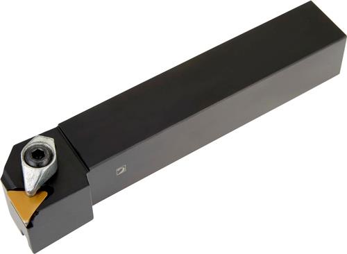 Dreh-Trägerwerkzeug von oben geklemmt zum spannen von Triangular positive Wendeschneidplatten mit einem Innenkreisdurchmesser von 9.525mm · 3.18mm Dick (ISO Bezeichnung TP.. 1603... ) · rechte Ausführung zum 90° Längsdrehen mit abgesetzem Schaft · 25mm Werkzeughöhe x 25mm Breite x 150mm Länge für Stirndrehen ohne Schulter