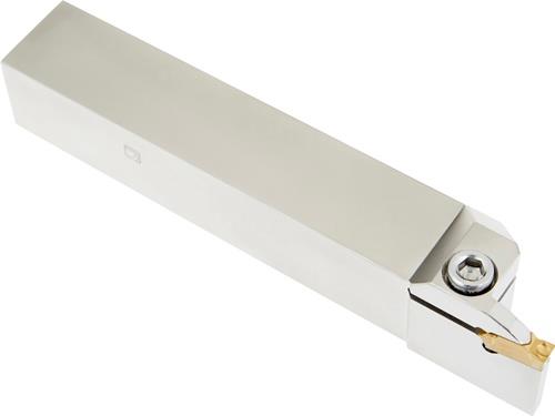 Einstechwerkzeug von oben geklemmt zum spannen einer 16.4mm langen doppelt oder einseitigen Wendeschneidplatte mit 4mm Schnittbreite (Bezeichnung LCM. 0416.. ) · linke Ausführung mit Wendeschneidplatte parallel zum Schaft für einen maximalen Stechdurchmesser von 24mm · Schafthöhe 25mm · Breite 25mm und Werkzeuglänge 150mm zum Mehrweg Kopierdrehen · flaches und tiefes radiales Einstechen · radiales Stechdrehen · Abstechen und Rohr-Abstechen