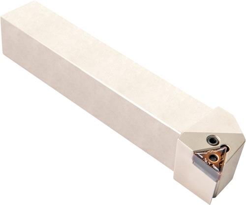 Dreh-Trägerwerkzeug mit Kniehebelklemmung zum spannen von Triangular negative Wendeschneidplatten mit einem Innenkreisdurchmesser von 9.525mm · 4.76mm Dick (ISO Bezeichnung TN.. 1604.. ) · linke Ausführung zum 90° Stirndrehen mit abgesetzem Schaft · 25mm Werkzeughöhe x 25mm Breite x 150mm Länge für Kegeldrehen und Längsdrehen ohne Schulter