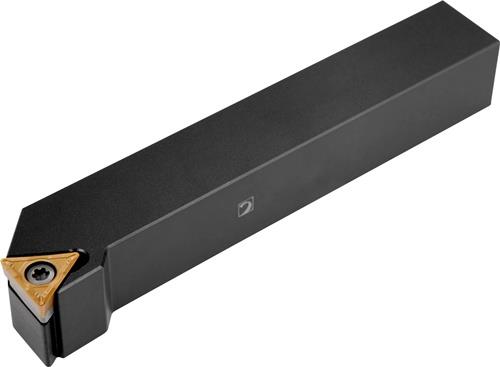 Dreh-Trägerwerkzeug mit Schraubklemmung zum spannen von Triangular positive Wendeschneidplatten mit einem Innenkreisdurchmesser von 6.35mm · 2.38mm Dick (ISO Bezeichnung TC.. 1102.. ) · rechte Ausführung zum 90° Längsdrehen mit abgesetzem Schaft · 16mm Werkzeughöhe x 16mm Breite x 100mm Länge für Stirndrehen mit und ohne Schulter