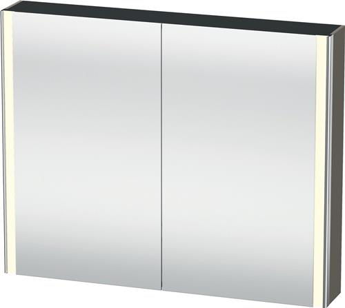 Duravit XSquare Spiegelschrank · Flanell Grau · Version: Sensor · Anzahl Türen: 2 · Türanschlag: Links · Rechts · Spiegelflächen: Türe(n) beidseitig · Rückwand · Anzahl Glasfachböden: 2 · Anzahl Holzfachböden: 1 · Material Korpus: Hochverdichtete MDF-Platte · 27 W · Betätigung Beleuchtung: Sensorschalter Unten · Rechts · Steckdose: Integriert · Anzahl Steckdosen: 1 · Typ Steckdose: E · 3500 K · Dimmfunktion: Integriert · Waschplatzbeleuchtung: Integriert · Leuchtmittel Lebensdauer: > 30000 h · Leuchtmittel austauschbar: Nein · Energieeffizienzklasse D