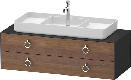 Duravit White Tulip Konsolenwaschtischunterbau wandhängend · 1300x550 mm · Farbe Front: Amerikanischer Nussbaum Matt · Farbe Korpus: Graphit Seidenmatt · Farbe Griff: Chrom Hochglanz · Anzahl Schubkasten: 2 · Anzahl Ausschnitte: 1 · Siphonausschnitt · Inkl. Konso
