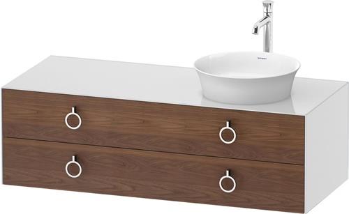 Duravit White Tulip Konsolenwaschtischunterbau wandhängend · 1300x550 mm · Farbe Front: Amerikanischer Nussbaum Matt · Farbe Korpus: Weiß Hochglanz · Farbe Griff: Chrom Hochglanz · Anzahl Schubkasten: 2 · Anzahl Ausschnitte: 1 · Siphonausschnitt · Inkl. Konsolenp