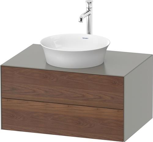 Duravit White Tulip Konsolenwaschtischunterbau wandhängend · 800x550 mm · Farbe Front: Amerikanischer Nussbaum Matt · Farbe Korpus: Stein Grau Seidenmatt · Anzahl Schubkasten: 2 · Anzahl Ausschnitte: 1 · Siphonausschnitt · Inkl. Konsolenplatte · Tip-on Technik -