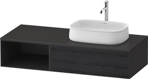 Duravit Zencha Konsolenwaschtischunterbau wandhängend · 1300x550 mm · Farbe Front: Eiche (Schwarz) Matt · Farbe Korpus: Graphit Supermatt · Anzahl Auszüge: 1 · Anzahl offener Fächer: 1 · Anzahl Ausschnitte: 1 · Inkl. Konsolenplatte · Tip-on Technik - ZE4819016800