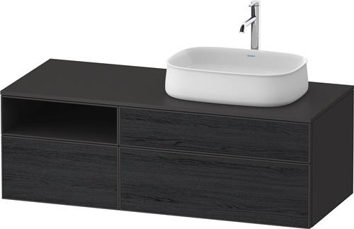 Duravit Zencha Konsolenwaschtischunterbau wandhängend · 1300x550 mm · Farbe Front: Eiche (Schwarz) Matt · Farbe Korpus: Graphit Supermatt · Anzahl Auszüge: 2 · Anzahl Schubkasten: 1 · Anzahl offener Fächer: 1 · Anzahl Ausschnitte: 1 · Siphonausschnitt · Inkl. Kons