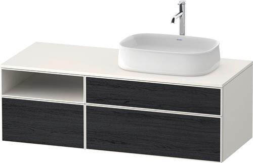 Duravit Zencha Konsolenwaschtischunterbau wandhängend · 1300x550 mm · Farbe Front: Eiche (Schwarz) Matt · Farbe Korpus: Weiß Supermatt · Anzahl Auszüge: 2 · Anzahl Schubkasten: 1 · Anzahl offener Fächer: 1 · Anzahl Ausschnitte: 1 · Siphonausschnitt · Inkl. Konsole