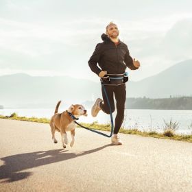 Dieser duvoplus Sportgurt ist sehr benutzerfreundlich, verrutscht nicht und ist geeignet, um freihändig Sport mit Ihrem Hund zu treiben. Befestigen Sie den verstellbaren Gurt um die Hüften und klicken Sie die Leine mit den drehbaren Karabinern am Metallring fest. Die Leine ist mit einem stoßabsorbierenden Teil versehen, der den ersten Stoß abfängt, wenn Sie oder Ihr Hund eine plötzliche Bewegung vollführen. Der Sportgurt hat eine komfortable Passform und besteht aus Nylon und Neopren, einem leichten, wasserfesten und atmungsaktiven Stoff. Die reflektierenden Streifen am Gurt und der Leine sorgen für optimale Sichtbarkeit im Dunkeln. Dank der kleinen Aufbewahrungstaschen können Sie Snacks, Kotbeutel, Ihr Mobiltelefon und Schlüssel mitnehmen. Das Hüftband hat auch einen Audio-Ausgang für Hörkomfort. Sorglos, sicher und komfortabel unterwegs mit den Accessoires „Buddies on the Gooo“ von duvoplus.