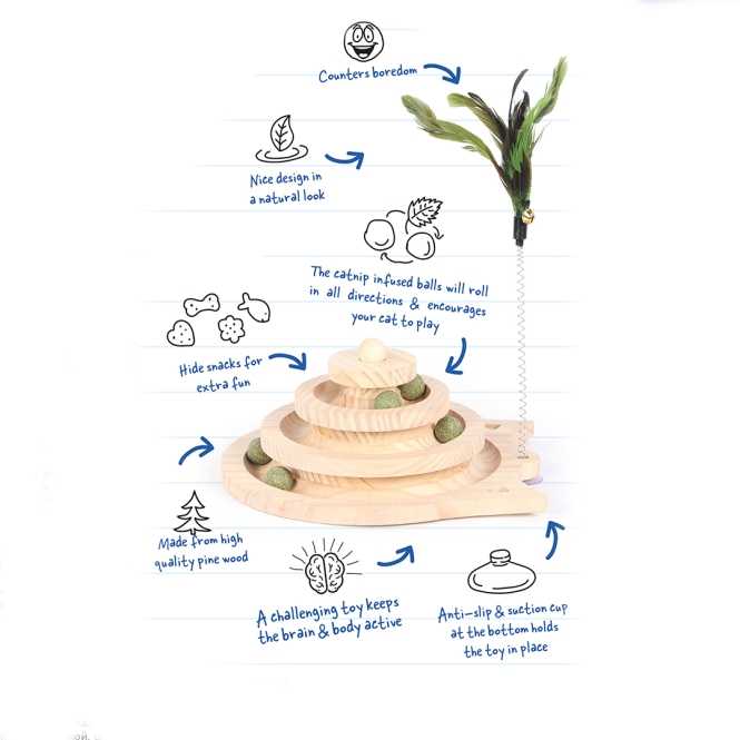 Halten Sie Ihre Katze bei Laune und animieren Sie sie mit diesem hölzernen Spin 'n play Spielturm von duvoplus. Ihre Katze kann einen der Bälle mit ihrer Schnauze oder ihrer Pfote berühren. Die Bälle rollen in alle Richtungen und sind zudem mit Katzenminze getränkt, um Ihre Katze zusätzlich zum Spielen und Bewegen anzuregen. Verstecken Sie leckere Snacks im Turm für noch mehr Unterhaltung! Der praktische Saugnapf an der Unterseite hält das Spielzeug an seinem Platz. Dieses hübsche Katzenspielzeug aus 100 % hochwertigem Kiefernholz ist eine ideale Ergänzung für Ihre Katze und Ihr Zuhause! Spaß garantiert.