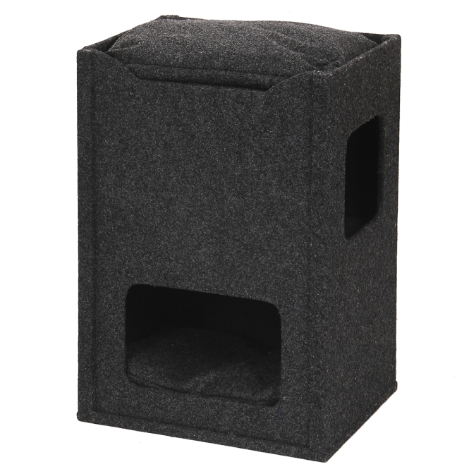 Die Kratzbox Cuby, in hochwertige Filzverkleidung, bietet Katzen eine Spiel- und Kratzfläche und einen bequemen Liegebereich. Die lange Sisal-Kratzseite bietet Katzen eine ausreichend große Fläche zum Schärfen der Nägel. Die Kratzbox hat zwei Öffnungen, sodass sich die Katze bequem zum Schlafen zurückziehen kann. Die Oberseite der Kratzbox bietet einen geräumigen, komfortablen Liegeplatz, von dem aus die Katze den Überblick behalten kann.