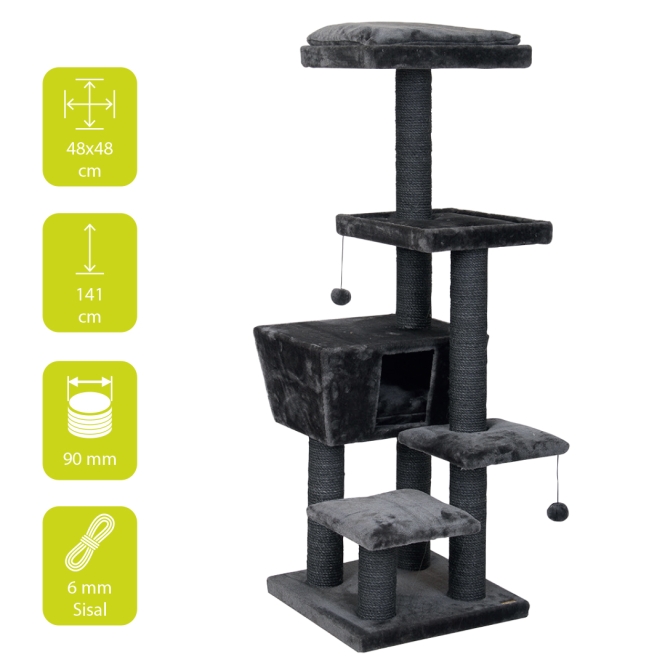 Der Kratzbaum Trend North Dakota ist ein moderner mittelgroßer Kratzbaum mit verschiedenen Liege- und Sitzbereichen sowie einem Ruhe- und Schlafhäuschen. Sehr robust und verschleißfest durch komplett verklebtes Sisal und Plüsch. Im Häuschen und auf der obersten Liegefläche ist ein weiches Kissen (Waschbar bei 30° C). Zusätzlich ist unter 2 Liegeflächen ein Spielball mit Gummiband angebracht, sodass die Katze nach Herzenslust spielen kann.