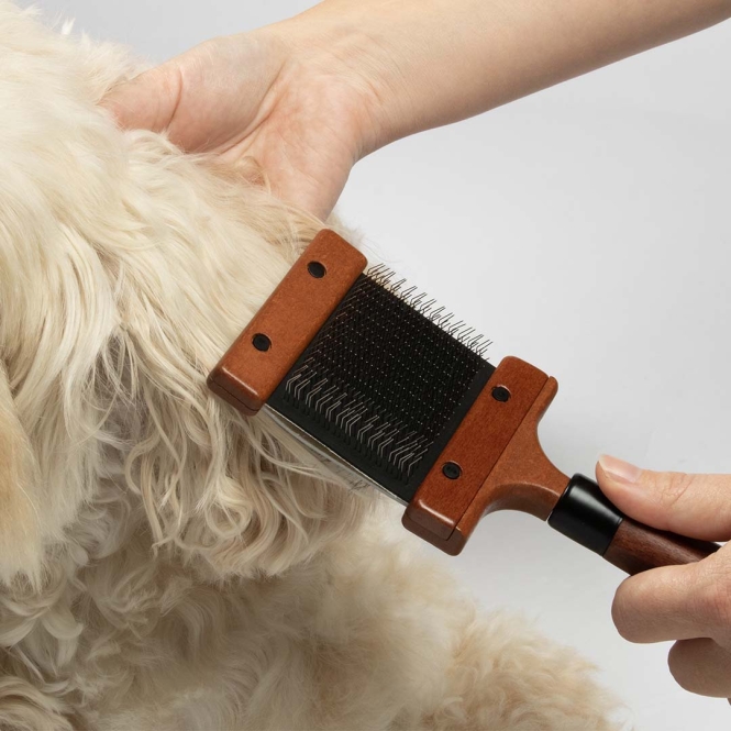 Die Duo-Slicker-Bürste von Noir Japandi verfügt über einen flexiblen Bürstenkopf, der sich mühelos an die Körperform Ihres Haustiers anpasst. Die Edelstahlstifte – kurz auf der einen und länger auf der anderen Seite – entfernen sanft lose Haare, Schmutz, Verfilzungen und abgestorbenes Unterfell, ohne die Haut zu reizen. Geeignet für alle Felltypen und ideal für langhaarige Tiere. Ausgestattet mit einem ergonomischen Griff aus FSC-zertifiziertem Buchenholz mit dunkel gebeizter Oberfläche.
