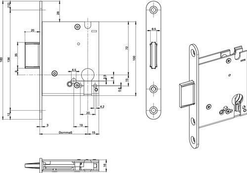 PZ Ausführung · allseitig geschlossener Schlosskasten · 1-tourig 20 mm · Stulplänge 160 mm · Dornmaß 55 mm · DIN links / rechts verwendbar · Riegel aus Zinkdruckguss · ohne Schließblech