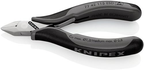 ESD · für feinste Schneidarbeiten z. B. in Elektronik und Feinmechanik · durchgestecktes, spielfreies Gelenk · Schneiden zusätzlich induktiv gehärtet, Schneidenhärte ca. 62 HRC · mit Öffnungsfeder · Spezial-Werkzeugstahl in Sondergüte geschmiedet, mehrstufig ölgehärtet · elektrisch ableitend - dissipativKopf spiegelpoliert