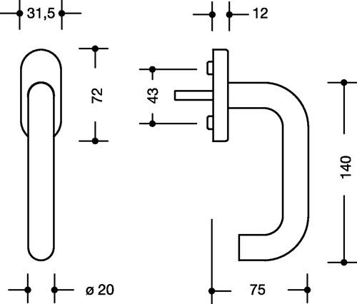 Edelstahl · Durchmesser 21,3 mm · 140 mm lang · mit 7 mm Vierkantstift · der Fenstergriff erfüllt die Vorgaben der DIN 18040 · Ovalrosette 72 x 31,5 mm · mit Stützzapfen · Lieferung ohne Befestigungsschrauben · Oberfläche des Fenstergriffes und der Rosette matt geschliffen