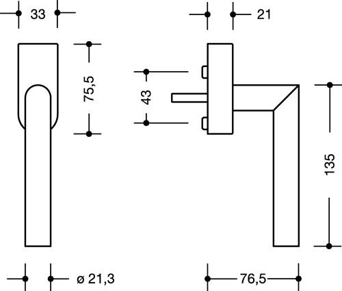 aus Edelstahlrundrohr im Gehrungsschnitt (1.4301), Durchmesser 21,3 mm, 135 mm lang, mit 1,5 mm Wandstärke, mit 90 Grad-Rastpunkten und 7 mm Vierkantstift, Länge 30 mm vorstehend. Vormontiert auf Rosette mit Metallunterteil, 75,5 x 33 mm, mit Stützzapfen Durchmesser 10 mm, verdeckte Verschraubung, Schraublochabstand 43 mm, Abdeckkappe aus Edelstahl (1.4301), Wandstärke 1,5 mm. Integrierter Druckzylinder mit 5 Stiftzuhaltungen, in allen Raststellungen schließbar, die Schließung wirkt direkt auf den Griff und blockiert die Drehung. Prüfung gemäß RAL-RG 607/9. Incl. 2 Schlüssel. Gleichschließend: alle Schließzylinder sind mit dem gleichen Schlüssel schließbar, Schließung 2W005