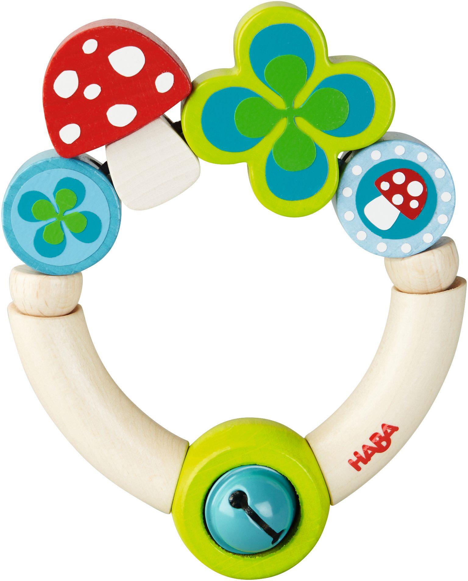 Mit Glöckchen, aus stabilem Buchenholz. Klingelt. Ca. 12 cm. Ab 10 Monaten.