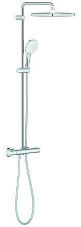 GROHE Tempesta System 250 Cube Duschsystem mit Thermostatbatterie für die Wandmontage bestehend aus: horizontal schwenkbarer 390 mm Brausearm Aufputz·Thermostat mit Aquadimmer Funktion ermöglicht den Wechsel zwischen: Kopfbrause Tempesta 250 Cube (26 685) Strahlart: Rain Kopfbrause mit weißer Rückseite mit Kugelgelenk · Drehwinkel +/· 10 Grad Handbrause Tempesta Cube 110 (27 571) 2 Strahlarten: Rain · Jet in der Höhe verstellbar mittels Gleitelement Rotaflex TwistStop Brauseschlauch 1.750 mm 1/2'' x 1/2'' (28 410) Maximaler Durchfluss (bei 3 bar): 7,3 l/min GROHE Water Saving· weniger Wasser · perfekter Wasserfluss GROHE TurboStat Kompaktkartusche mit Dehnstoff·Thermoelement GROHE SafeStop Sicherheitssperre bei 38 GradC GROHE SafeStop Plus optional einsetzbarer Temperaturendanschlag bei 43 GradC GROHE SmartSwitch Strahlumstellung per Drehscheibe GROHE DreamSpray Perfektes Strahlbild ShockProof Silikonring schützt vor Beschädigung bei Herunterfallen der Brause GROHE Long·Life Oberfläche SpeedClean Antikalk·System Innenliegende separate Wasserführung TwistStop gegen Verdrehen des Brauseschlauchs für Durchlauferhitzer ab 18 kW/h geeignet Mindestdurchfluss 7 l/min optionales Zubehör: GROHE EasyReach Ablage (26 362)